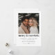 Esta tarjeta de vacaciones está diseñada para recién casados que celebran su primera Navidad de casados, combinando la simplicidad moderna con el encanto de la temporada. Cuenta con una foto cuadrada que puedes subir para mostrar tu momento favorito juntos. La frase "feliz y casado" en un diseño tipográfico audaz está acompañada de un delicado corazón al lado. Debajo, tus deseos personalizados de vacaciones se muestran elegantemente en dos fuentes complementarias, junto con el año en la parte inferior, creando un recuerdo atemporal.