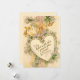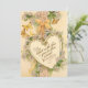 Elegante y romántica tarjeta de El día de San Valentín vintage con corazón dorado, saludo, cintas, flores y mariposas.