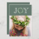 Tipografía festiva de "Alegría" con corona de eucalipto falso para la letra "O". Agrega tu foto personal para completar esta tarjeta de vacaciones. Agrega tu propio sentimiento navideño y nombres en el reverso. El patrón del frente se lleva al dorso de esta tarjeta.