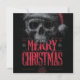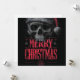 diseño gráfico audaz y desgastado que presenta una calavera muy detallada y dibujada a mano que está amenazadoramente coronada con un sombrero rojo de Santa deteriorado. La ilustración tiene una apariencia pesada, texturizada y ligeramente salpicada, sobre un fondo gris oscuro. Debajo de la calavera, las palabras "FELIZ NAVIDAD" se presentan en tipografía roja prominente y estilizada. Este diseño ofrece una interpretación única y alternativa de la temporada navideña.
