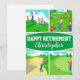 Feliz Jubilación. Tarjeta de retiro temática de Golfer. Cuatro ilustraciones de golf muy graciosos. En uno, un golfista está tomando un tiro en un campo de golf. El perdedor-golpea la pelota de golf y sus compañeros de golf encuentran esto hilarante y se están riendo incontrolablemente. En otro, un golfista toma un tiro en un campo de golf y tiene numerosos rebotes de suerte que sorprenden a sus amigos. También un personalizado donde un golfista está atrapado en un búnker y sin tener mucha suerte saliendo de la trampa de arena. Por último, un golfista está en el green, pero pierde su putt por una fracción. Personalizados del caricaturista británico Nigel Sutherland.