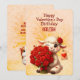 Una tarjeta de cumpleaños personalizada para alguien que cumple años el Día de San Valentín. Un lindo cordero blanco que presenta un gran ramo de rosas rojas en la parte delantera y un pequeño hámster haciendo lo mismo en la parte posterior.