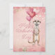 Happy Valentine's Day romantic card with a personalized message and a meerkat illustration with heart balloons. Pink and red background with a plaid backing.