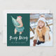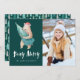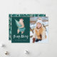 ¡Desee a amigos y familia una Navidad Beary Merry con nuestras tarjetas de fotos de Beary Merry! Las lindas tarjetas navideñas incluyen un oso marrón que lleva un sombrero de Papá Noel cargando un árbol de Navidad de vuelta a su cueva. Las palabras "Beary Merry" se muestran a continuación en una letra blanca con letras a mano contra un fondo verde del bosque. Personalice agregando su foto favorita y sus nombres. El reverso de la tarjeta presenta un lindo patrón de árbol de Navidad en varios tonos verdes y verde azulados.