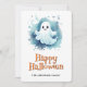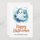 Carta feliz de Halloween con un ilustracion acuarela de un bonito fantasma sonriente. Personaliza fácilmente esta tarjeta de Halloween para los niños con tu nombre y texto familiar.