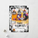 Esta encantadora tarjeta plana de Halloween muestra adorables gnomos posados en la palabra "BOO", acompañados de la frase "FELIZ HALLOWEEN". El diseño está repleto de divertidos motivos de Halloween, incluyendo telarañas, fantasmas, calabazas, calaveras y salpicaduras de sangre. Un borde negro desgastado enmarca la tarjeta, mientras que la parte trasera presenta un patrón de araña espeluznante junto con el mismo borde desgastado.