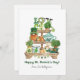 Tarjeta divertida del Día de San Patricio que presenta una ilustración de un soporte de knickknack irlandés lleno de curiosidades divertidas junto con las palabras "¡Feliz Día de San Patricio!". Personalízala con tu propio mensaje y nombres o déjala en blanco para escribir lo tuyo. Perfecta para desear a tus familiares y amigos un poco más de suerte este año.
