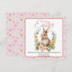 Delight in springtime sweetness with this adorable watercolor bunny nestled in a lush floral wreath — featuring soft peach peonies, yellow ranunculus, sage greenery, and delicate succulents. The central illustration is framed by a gentle pink rounded border, all set against a charming repeat background of tiny carrots, bunnies, and the words “Hi”, “Love”,Cute”, “Rabbit” in playful script on textured pink paper.