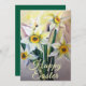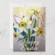Bouquet de daffodils con mensaje Feliz Pascua delante. Una hermosa tarjeta para unas hermosas vacaciones para enviar a la familia y amigos. Las tarjetas pueden ser enviadas raramente pero son muy amadas por el receptor.
