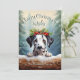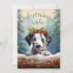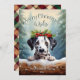 Esta adorable tarjeta de saludo de vacaciones incluye un lindo ilustracion de perro dálmata con una corona festividad de flores de invierno, hojaldre, pino y bayas, con copos de nieve cayendo suavemente contra una escena boscosa de bosques de invierno. ¡El pequeño dálmata está mirando sobre el tronco nevado para saludar! El lúgubre texto "Feliz Navidad Deseos" agrega un cálido saludo de temporada, y puede ser personalizado como quieras. El reverso está decorado con un clásico rayo de chapa que añade un toque tradicional al conjunto. Esta bonita y divertida tarjeta es perfecta para enviar vítores de vacaciones a la familia y amigos, y el nombre del personalizable y la fecha lo convierten en un placer personalizado.