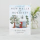 Estamos decorando nuevos pasillos para las fiestas Anuncio de mudanza Tarjeta de Navidad. Foto familiar favorita en la parte posterior. Tarjeta de anuncio de mudanza de escenas nevadas en casa.