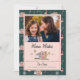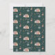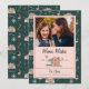Ilustración de una casa moderna de mitad de siglo rosa decorada con luces de Navidad. El fondo tiene un patrón con bastones de caramelo, casa, flamencos y copos de nieve. Personalice con la foto de su familia.