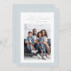 Enmarcada en copos de nieve, esta tarjeta de vacaciones de una foto es la forma perfecta de enviar deseos cálidos esta Navidad. Con un elegante "Feliz Navidad" de letra moderna, esta tarjeta también tiene espacio para texto personalizado que puede incluir nombres y año. La parte posterior es un salpicado de tormenta de nieve que coincide con un cielo invernal azul claro. Esta tarjeta de foto vertical es ideal para familias, parejas y más. También disponible como diseño horizontal.
