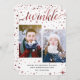 Nuestra encantada tarjeta de 2 fotos de deseos presenta tipografía de escritura caprichosa para "mellizas" y estrellas y caída de nieve en burdeos. Personaliza fácilmente con tus fotos y tu nombre de familia. Tarjetas fotográficas encantadas