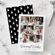 Tarjeta de vacaciones moderna con 6 fotos dispuestas en forma de collage. Los "Deseos más cálidos" se muestran en un guión negro escrito a mano con el nombre de su familia y el año que se muestra a continuación. La tarjeta multifoto de vacaciones se revierte para mostrar un patrón de árbol de Navidad en blanco y negro.