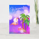 Esta tarjeta de saludo de vacaciones de los Navidades Warmest incluye un flamingo rosa con palmeras y regalos decorados en una noche de playa tropical iluminada. Saludo interno ~ "De nuestro paraíso de vacaciones a los tuyos". ^