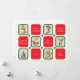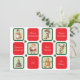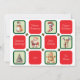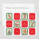 Imágenes lindas con tema de Navidad en cuadrados verdes individuales que se alternan con cuadrados rojos que tienen diferentes deseos de fiesta. Las imágenes son un muñeco de nieve, una media a rayas de bastón de caramelo, un Santa Claus, un reno, un árbol de Navidad decorado y una galleta de hombre de jengibre. Todos los deseos de fiesta se pueden cambiar fácilmente a cualquier saludo que prefiera. El texto en el reverso también se puede cambiar o eliminar fácilmente si desea escribir su mensaje a mano.