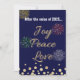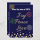 Esta moderna tarjeta de vacaciones es la manera perfecta de enviar un sincero saludo sin fotos esta temporada. El frente cuenta con un elegante fondo marino con fuegos artificiales festivos y un potente mensaje: "Después del ruido de 2025... Que tus vacaciones estén llenas de Alegría, Paz, Amor". La parte trasera está diseñada para un mensaje personal y el nombre de tu familia, terminados con una sutil dispersión de confeti dorado para atarse a la sensación de celebración. Es una carta limpia y única para enviar un mensaje reflexivo a estos Navidades.