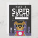 Tarjeta del día de San Valentín linda para que su hijo la dé en el aula a sus amigos. Es una ilustración de un perro con un traje de superhéroe. Hay un horizonte de la ciudad en la parte de atrás. El texto de arriba dice "Que tengas un día de San Valentín SUPER". Puede agregar el nombre de su hijo en la tarjeta y hay un espacio en blanco en la tarjeta donde puede rellenar el nombre del destinatario.