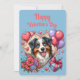 Tarjeta del día de San Valentín con un Pastor Australiano de ojos azules con un regalo, flores y globos.