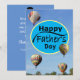 La parte delantera de la tarjeta presenta fotografía de globo aerostático y dice, "Día del Padre Feliz" La parte trasera de la tarjeta tiene fondo azul y texto blanco que dice, "Saber que estás ahí para mí, me levanta y me anima. Gracias, Papá! Con Amor, Jen." Personaliza con tu nombre.