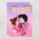 Presentamos una encantadora tarjeta del Día de San Valentín que presenta una ilustración de un adorable niño y niña, todo listo para compartir un beso romántico en un dulce abrazo. ¡Tan simple y sin embargo tan dulce! El pequeño niño esconde globos con forma de corazón detrás de su espalda que simplemente dicen: "Sé mío". También cuelga encima de ellos una pancarta con las palabras "AMOR". Un par de pájaros del amor se sientan posados en la pancarta. Este diseño se puede utilizar para múltiples ocasiones, cumpleaños, aniversarios, etc.