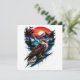 Digital illustration of a red-tailed hawk perched on a blue splattered rock. The hawk has detailed brown and white feathers, yellow talons, and a sharp yellow beak. Behind it, a vibrant sunset with a red-orange sky, silhouetted pine trees, and snow-capped mountains. The background features dynamic brush strokes and splatters, blending realism with abstract art styles. The overall color palette includes rich browns, whites, blues, and reds.