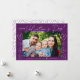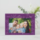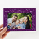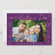 Tarjeta El día de San Valentín moderna con "Feliz Día de San Valentín" en un moderno guión en blanco con corazones dibujados a mano a lo largo de los lados de la tarjeta en un fondo morado. Su foto horizontal se muestra cerca del centro del diseño. Personalice la tarjeta de foto El día de San Valentín morada añadiendo su nombre y el año con letras blancas. La carta se invierte para mostrar un patrón de corazones morados.