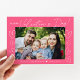Tarjeta El día de San Valentín moderna con "Feliz Día de San Valentín" en un moderno guión en blanco con corazones dibujados a mano a lo largo de los lados de la tarjeta en un fondo rosado. Su foto horizontal se muestra cerca del centro del diseño. Personalice la tarjeta de foto El día de San Valentín rosa agregando su nombre y el año con letras blancas. La carta se invierte para mostrar un patrón de corazones rosados.