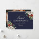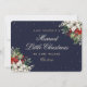 Elegant blue photo holiday/Christmas wedding announcement card featuring little stars adorned with white poinsettia, red berries and winter greenery on the front and a photo at the back. Easily personalize this blue photo holiday card with your family photo and the family name.