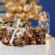 This Christmas card has a vintage Victorian style, featuring an elegant collage of classic holiday elements. The design includes richly detailed illustrations of Santa Claus, angels, Victorian-era women, and festive decorations like poinsettias, pinecones, and ornaments. The color palette is dominated by deep reds, ivory, gold, and soft browns, creating a luxurious and nostalgic feel. Each element is framed in ornate, gilded borders with a touch of sparkle, enhancing the antique and opulent appearance.