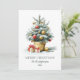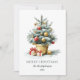 Our wonderful little Christmas tree in a gold pot is elegant for the holiday season, but somehow at the same time is cute as can be. We love the shiny gold and red ornaments, dusting with snow, and red-ribboned bows on presents ready to be given. All done in watercolor of vintage origin, but you wouldn’t know it because it looks so modern and trendy. We hope you love it too and will enjoy sending this “Merry Christmas” flat holiday card to your beloved relatives and friends this wintertime.