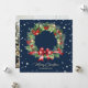 Elegante foto azul Feria tarjeta navideña con una corona acuarela de bayas, hueso, conos de pino y ramas de árboles de coníferas. Una foto en la parte trasera. Personaliza fácilmente esta tarjeta azul de vacaciones con tu foto y nombre de familia.