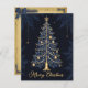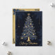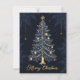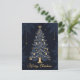 Esta tarjeta de Navidades de diseño elegante cuenta con un árbol de Navidad elegantemente decorado con adornos y luces dorados, coronado por una estrella dorada brillante. El árbol se sitúa de forma prominente en un fondo oscuro con patrones de hojas sutiles y pequeñas estrellas doradas que cuelgan a su alrededor. En el fondo, "Feliz Navidad" está escrito en un elegante guión dorado. La parte delantera de la tarjeta capta el espíritu festivo con su diseño intrincado y festivo. En la parte posterior, la tarjeta presenta una página en blanco de estilo vintage con copos de nieve decorativos, lo que proporciona un amplio espacio para escribir un mensaje personal y sincero. Perfecto para enviar cálidos deseos de vacaciones a sus seres queridos.