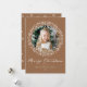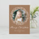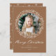 Elegante tarjeta de vacaciones con tu foto rodeada por una corona de copas de nieve y ramas de pino blanco sobre un fondo festivo de color jengibre. "Feliz Navidad" se muestra en un guión en negrita de caligrafía blanca con tu nombre y el año que se muestra a continuación. La parte trasera de la moderna tarjeta de vacaciones cuenta con un bonito patrón de copos de nieve.