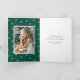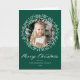 Elegante tarjeta de vacaciones con tu foto rodeada por una corona de copas de nieve y ramas de pino blanco sobre un fondo festivo verde. "Feliz Navidad" se muestra en un guión en negrita de caligrafía blanca con tu nombre y el año que se muestra a continuación. El interior de la moderna tarjeta de vacaciones incluye una foto adicional con un hermoso fondo de copos de nieve. Añade un mensaje personal o deja en blanco para escribir a mano el tuyo propio.
