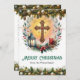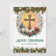 Una cruz elegante, iluminada por el suave resplandor de una linterna y velas, está bellamente enmarcada por hojas de borde Navidad con adornos y bellotas en esta tarjeta de saludo. El diseño capta la luz de Cristo, una fuerza guía en nuestras vidas, aportando calor y esperanza durante la temporada navideña. Los detalles intrincados de la linterna y las velas que parpadean mejoran el ambiente sereno y sagrado de la carta. Con espacio en la parte de atrás para tu mensaje personal, esta tarjeta es una manera perfecta de celebrar lo sagrado de los Navidades y recordar a los receptores el amor divino y la luz que Cristo trae.