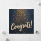 Esta elegante y festiva imagen presenta una ráfaga de confiti dorado y purpurina en cascada desde la parte superior del cuadro. El oro brillante brilla con fuerza contra un fondo azul marino profundo y texturado. El punto central es la palabra "¡Felicidades!", escrita en un tipo de letra negrita, cremosa y blanca, estilo de pincelada, que añade un toque personal y artístico. Este gráfico es perfecto para anunciar un éxito, una graduación o cualquier otro hito alegre con un toque de sofisticación y estilo.