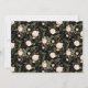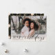 Estas hermosas tarjetas de vacaciones para Navidades de fotografía presentan una tipografía elegante que dice "Felices Fiestas" en negro. Una tira de color marfil en la parte inferior, junto con una superposición fotográfica de gradiente blanco, permite que el texto destaque contra la foto. La parte posterior de la tarjeta contiene un patrón floral en verde oliva, melocotón claro y naranja quemado en terracota sobre un fondo negro (el color de fondo se puede personalizar si se desea). Fácil de personalizar para las tarjetas elegantes que enviar a la familia y amigos!