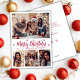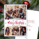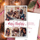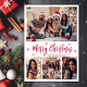 Tarjeta de Navidad elegante y moderna con 4 fotos en rojo. Esta festiva y minimalista plantilla de tarjeta de cuatro (4) fotos presenta un bonito collage de fotos, algunos copos de nieve y dice ¡Feliz Navidad! El texto de saludo "Feliz Navidad" está escrito en una hermosa fuente de caligrafía con pincel de letra manuscrita caprichosa (o tipografía) en rojo sobre fondo blanco. En el reverso con plantilla de texto de saludo. Bonita tarjeta de felicitación para su familia y amigos en esta Navidad y temporada festiva.