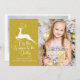 Un elegante ciervo blanco salta por encima de las palabras de los Navidades Esta es la temporada para ser alegre en esta hermosa tarjeta de vacaciones. Clásica elegancia con un reno de bonito sobre una magnífica caligrafía y una foto familiar llenando la parte delantera de esta tarjeta de felicitación dorada. La parte de atrás es un simple patrón de puntos polka de moda sobre blanco.
