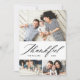 Presentando tres de tus fotos con un elegante y moderno guión de caligrafía que dice "Agradecido". Personaliza con tus propias fotos, nombre y texto. La parte posterior presenta un patrón de comprobación de búfalo de color gris y blanco para un toque especial. No deje de visitar la tienda para ver más tarjetas de fotos de Día de Acción de Gracias.