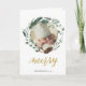 Envíe saludos y deseos de vacaciones a amigos, colegas y familia en festividades de diseño fotográfico simple, lindo, moda, elegante y moderno, con un estilo natural de color plegado tarjetas de vacaciones! Una hermosa corona de flores de hojas de acuarela pintadas de color verde suave (pino, eucalipto, helecho) con conos de pino marrón bonito y magnolia de marfil delante. Debajo de la foto se muestra oro "Merry" en elegante caligrafía con letras a mano y tu mensaje de bienvenida personalizado "Feliz feriado" en tipografía, nombres y el año romanos.