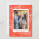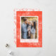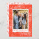 Elegante tarjeta de vacaciones con tu foto enmarcada por flores blancas de pino, pinecones y boughs de pino sobre un fondo festivo naranja. "Feliz Navidad" se muestra en letras clásicas del naranja con el nombre de tu familia debajo. La tarjeta de vacaciones moderna se invierte para mostrar un patrón naranja que coincida.