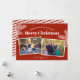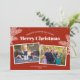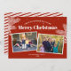 Esta elegante tarjeta de Navidades presenta un fondo rojo oscuro con gráficos y texto que aparecen en blanco. Este moderno diseño ofrece 2 fotos horizontales acentuadas con ramas de pino de invierno. El saludo dice: "De nuestra casa a la suya Feliz Navidad". Fotografía © Storytree Studios, Stanford, CA