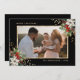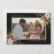 Elegante tarjeta de Navidades de fotografía en blanco y negro con poinsettia blanca, bayeta y bayas.
