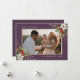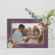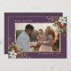 Elegante tarjeta de Navidades de fotos en color violeta y dorado con poinsettia blanca, bayeta y bayas.