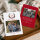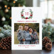 Envíe saludos de vacaciones intemporales con esta elegante tarjeta de vacaciones monograma de corona de poinsettia. El diseño presenta una cortina acuática festiva de poinsettias rojas, bayas y vegetación que enmarca una inicial audaz en la parte superior. Debajo, "Feliz Navidad" se muestra en letras rojas clásicas con espacio para mostrar tu foto familiar favorita. Personalice con su nombre y año familiar una carta de Navidades moderna y tradicional que combina el encanto festivo con el estilo personal. En la parte trasera hay espacio para una foto o un mensaje personalizado adicional, por lo que es perfecto para compartir sus deseos de vacaciones con sus seres queridos.