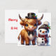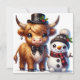 Difunde alegría festiva con esta encantadora tarjeta de vacaciones plana que muestra a una elegante vaca de las Highlands con sombrero de copa y corbatín, acompañada de un alegre muñeco de nieve. Un diseño divertido y conmovedor para hacer sonreír a cualquiera en esta época navideña