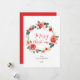 Elegante tarjeta de vacaciones con una cortina de flores rojas y coralinas y hojas de eucalipto, en un marco circular, sobre un fondo blanco, delicado, romántico, botánico. Si necesita cualquier otro producto o personalización que coincida, por favor contáctame.